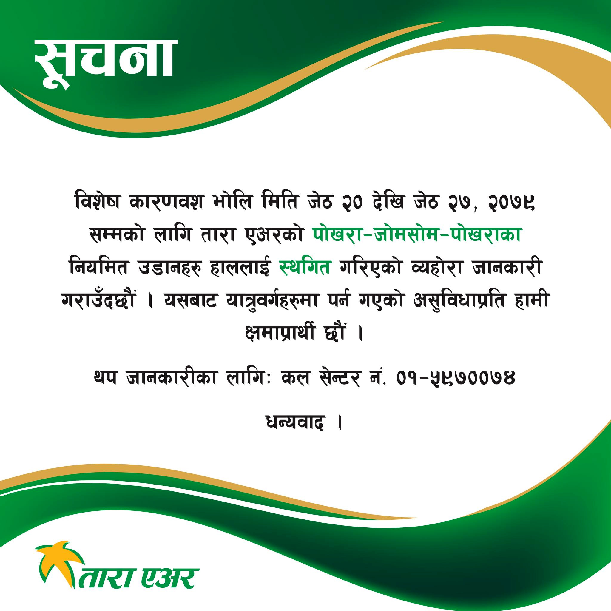 तारा एयरकाे पोखरा-जोमसोम-पोरखा उडान बन्द हुने भएको छ । २० देखि २७ जेठसम्मका लागि उक्त रुटको उडान बन्द गरिएको यति एयरले जनाएको छ ।